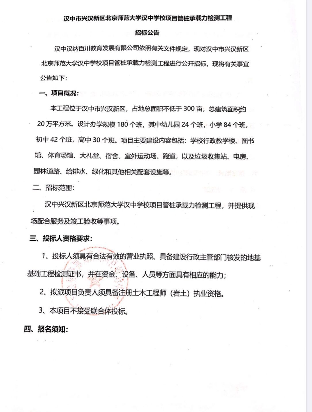 漢中市興漢新區(qū)北京師范大學(xué)漢中學(xué)校項目管樁承載力檢測工程招標(biāo)公告 漢中漢納百川教育發(fā)展有限公司...
